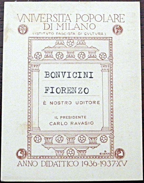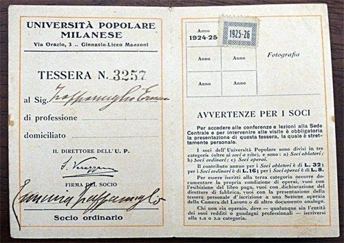Tessera n. 3257 dell'Università Popolare Milanese